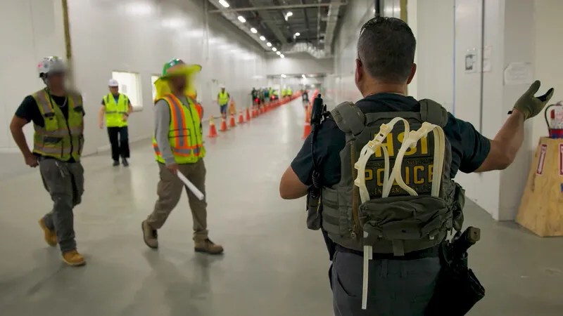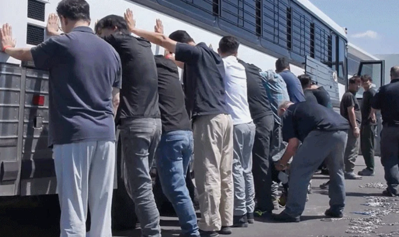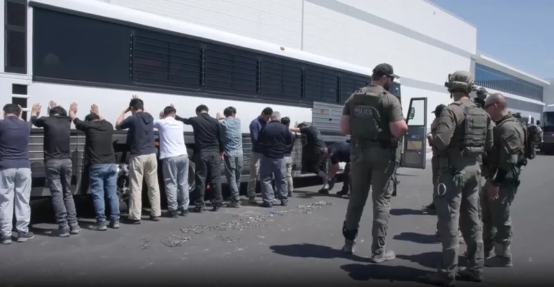 영상에는 유니폼을 입은 마약단속국 요원 10여명이 양손 결박용으로 추정되는 끈 뭉치를 지닌 채로 건물 밖에서 대기하는 모습이 나왔다. 버스에 양손을 짚고 일렬로 늘어선 현장 직원들을 단속 요원들이 차례로 다리와 양손에 체인을 묶어 버스에 태우는 장면도 담겼다.