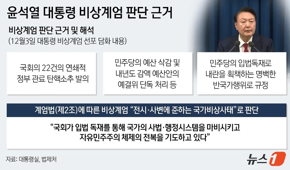 오죽하면 역대 계엄령 선포 사유와 비교해 이전에는 (적어도 보수 진영 입장에서는) 비상사태라고 선포할 만한 중대한 사유가 있었는데, 이번에는 더불어민주당이 예산 통과 안 시켜준 게 이유냐며 조롱하는 글이 커뮤니티에 올라왔다. 실제로 이후 더불어민주당의 폭거 때문에 계엄을 포고했다는 윤석열 대통령의 발언이 4일 여당과의 회동에서 나왔다. 한국경제 같은 회동에서 더불어민주당을 종북 좌파로 몰며 국가 권력으로 처단해야 한다는 스탠스를 고수하며 당의 협력을 요구하기도 했다[중앙일보]